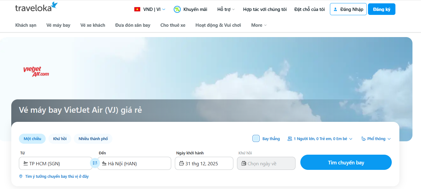Để tìm chuyến bay giá rẻ Vietjet dịp Tết, ngoài website chính thức của hãng, bạn nên ưu tiên sử dụng Traveloka - một trong những nền tảng đặt vé máy bay trực tuyến uy tín và tiện lợi nhất tại Việt Nam. Traveloka cho phép so sánh giá theo ngày, theo giờ, hiển thị toàn bộ chuyến bay Vietjet trên cùng một màn hình, theo dõi biến động giá liên tục nhiều ngày và dễ dàng chọn vé rẻ phù hợp ngân sách, kèm theo nhiều ưu đãi đặc biệt dịp Tết. Nhờ đó, bạn tiết kiệm đáng kể thời gian và không bỏ lỡ các mức giá tốt nhất trong giai đoạn cao điểm.